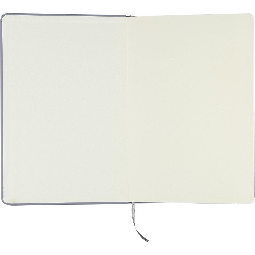 A5-ös méretű jegyzetfüzet rPET PU anyagból készült kemény borítóval, 80 vonalas lappal (70g/m2), színben illeszkedő gumipánttal és könyvjelző szalaggal. Az újrahasznosított anyagra utaló dombornyomott logóval a füzet hátoldalán.