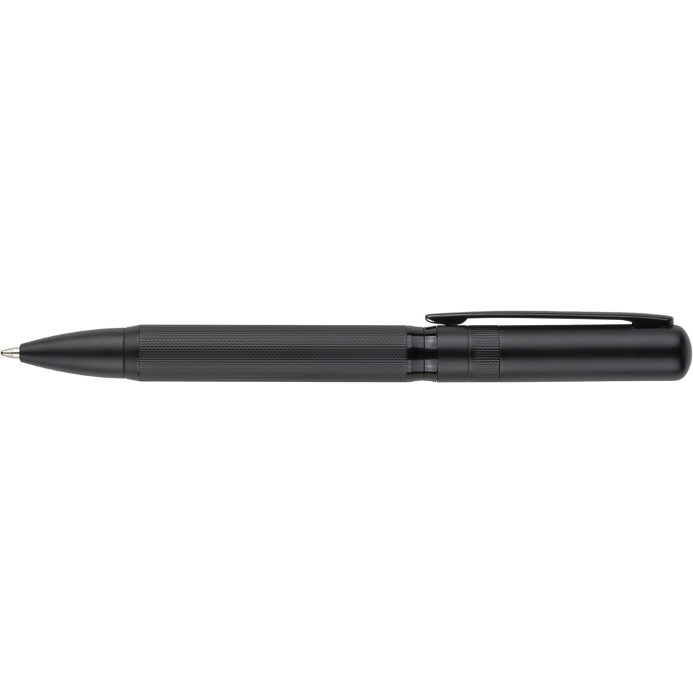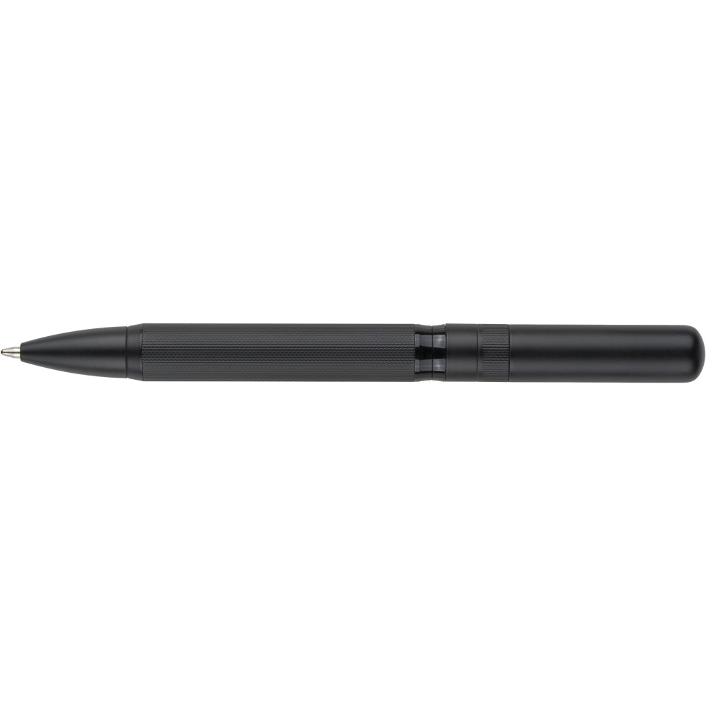 Ólommentes, környezetbarát Ecobrass rézötvözetből készült csavarós golyóstoll a toll színével harmonizáló fém klippel és forgó mechanizmussal. Kék színű, német Dokumental tollbetéttel felszerelve, megközelítőleg 1 000 méter íráshosszal. Darabonként fekete tolódobozba csomagolva.