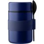 Rozsdamentes acél, duplafalú ételtartó (460 ml) fekete PP kanállal és a tartó színével megegyező szilikon markolattal, belső része 304-es, külső része 201-es rozsdamentes acél, PP fedéllel kerül szállításra, darabonként barna kartondobozba csomagolva.