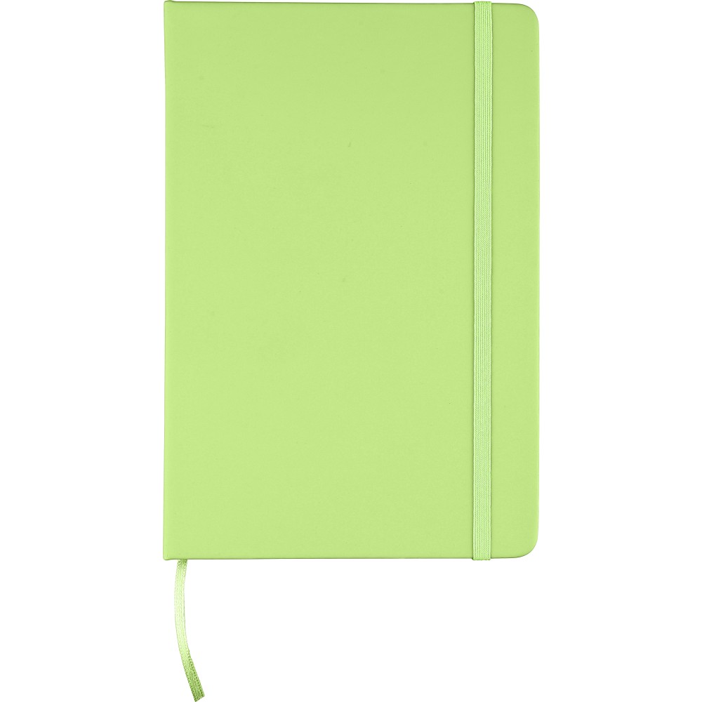A5-ös méretű jegyzetfüzet rPET PU anyagból készült kemény borítóval, 80 vonalas lappal (70g/m2), színben illeszkedő gumipánttal és könyvjelző szalaggal. Az újrahasznosított anyagra utaló dombornyomott logóval a füzet hátoldalán.