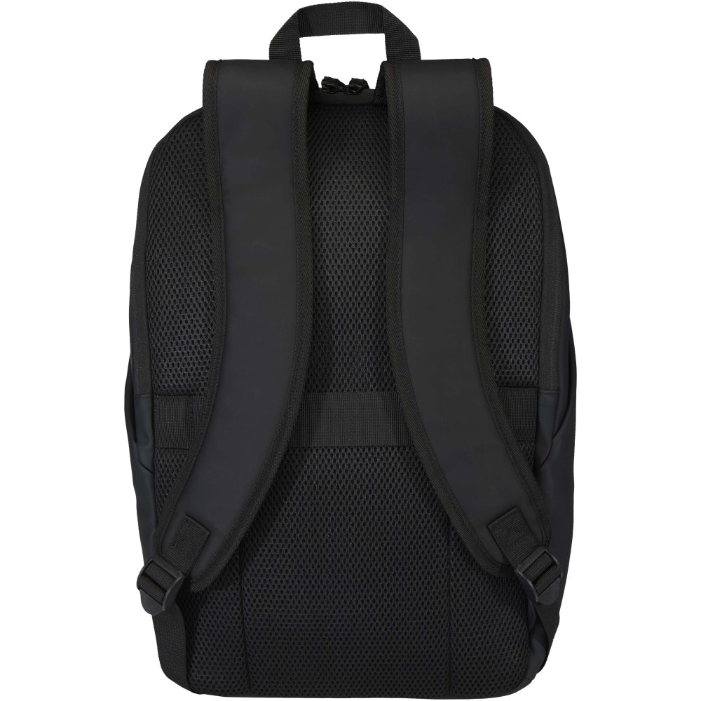 A prémium minőségű, GRS tanúsítvánnyal rendelkező újrahasznosított PU bőrből készült, színben passzoló RPET béléssel ellátott 15?-os biztonsági hátizsák garantálja az értékek védelmét és szárazon tartását útközben. A termék hátulról hozzáférhető laptoprekeszel, két letisztult oldalsó zsebbel, valamint egy vízálló cipzárral felszerelt elülső zsebbel rendelkezik. A légáteresztő hátlap biztosítja az egész napos kényelmet, így ideális választás ingázáshoz, utazáshoz vagy városi használatra. Űrtartalma: 18 liter.