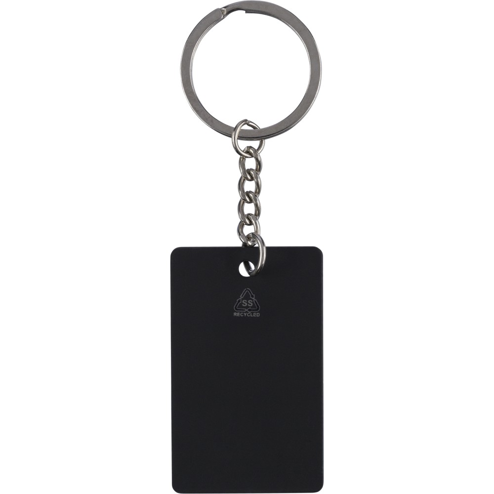 Újrahasznosított rozsdamentes acélból készült, gumírozott felületű, téglalap alakú kulcstartó fém karikával. A kulcstartón gravírozott recycled (újrahasznosított) alapanyagra utaló logó található, amely gravírozás után fényes, tükörszerű hatást mutat. Egyenként kraft papírtasakba csomagolva.