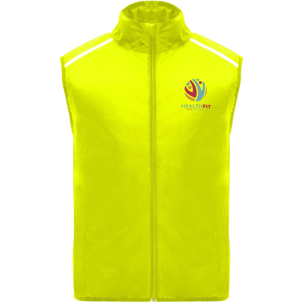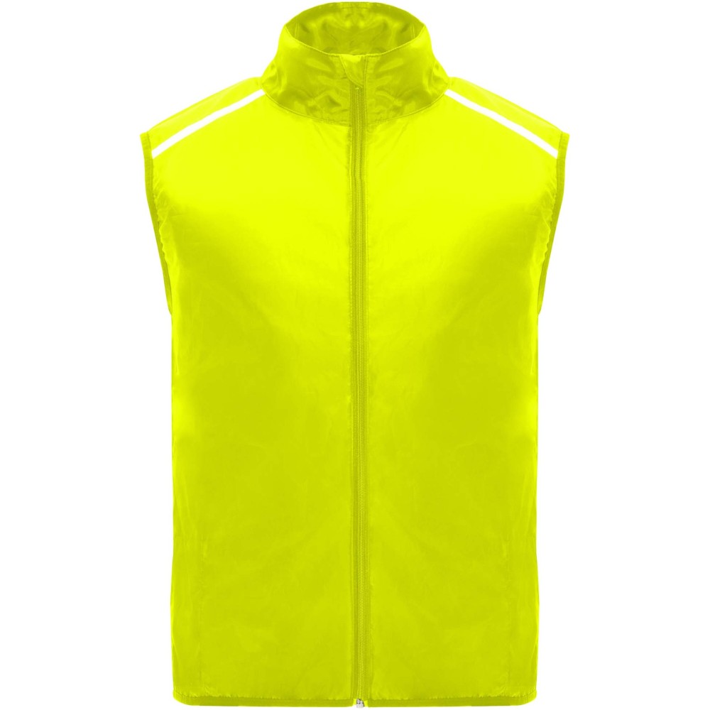 Szélálló és légáteresztő. Elülső cipzár azonos színű állvédővel. Rugalmas szegély a karkivágásnál és az alján. A hát alsó része mikroperforált anyagból készült. Fényvisszaverő csíkok a vállán. Zseb rugalmas pánttal, amelybe a mellényt el lehet csomagolni. Eltávolítható címke.
