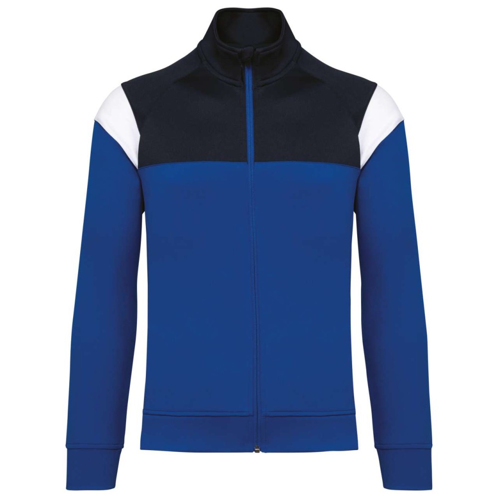 Anyaga: 100% matt poliészter interlock. Egyenes szabás. Elöl fordított cipzáras záródás színazonos nejlonból. Raglán ujjak kontrasztos vállbetétekkel. Kontrasztos mell- és vállkialakítás. Két cipzáras elülső zseb. Texturált anyagbetétek az oldalakon és a hátrészen. Cipzárfedő a felső nyakkivágásnál a nagyobb kényelem érdekében. Könnyen eltávolítható márkajelzés a dekorációhoz.