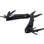 Fekete alumíniumból és rozsdamentes acélból készült multifunkciós szerszám 13 funkcióval, beleértve a késeket, csavarhúzókat, fogót, fűrészt, reszelőt, emelőkart, biteket, rugót, rögzítőrudat, konzervnyitót és támasztékot. Tokkal szállítva, amely tépőzáras övbújtatóval rendelkezik, valamint további külső dobozzal. Darabonként barna kartondobozba csomagolva.